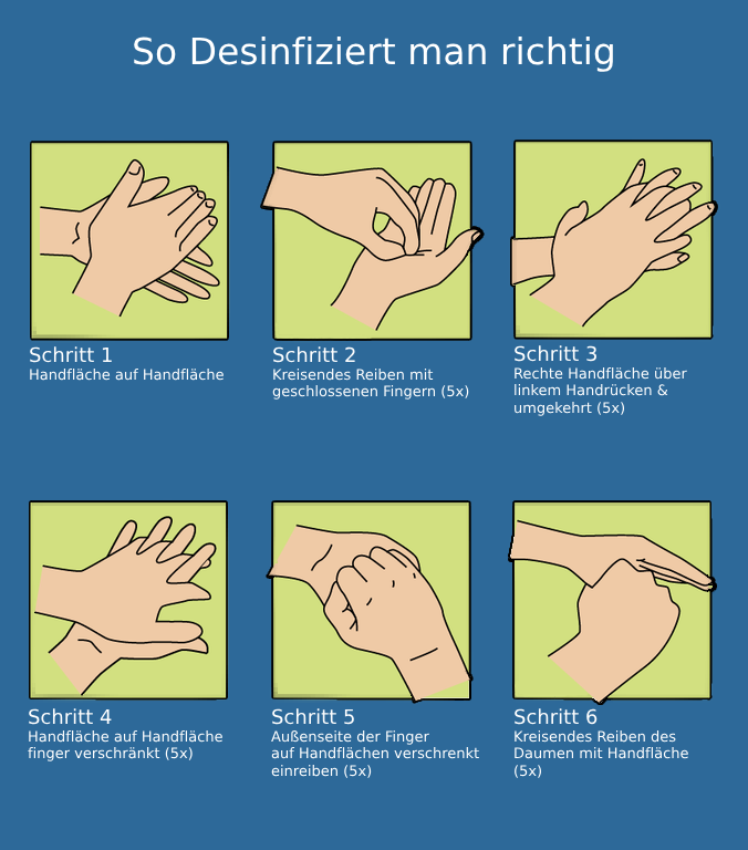 - Achten Sie darauf, dass die Hände während der gesamten Einwirkzeit (mindestens 30 Sekunden) feucht bleiben.